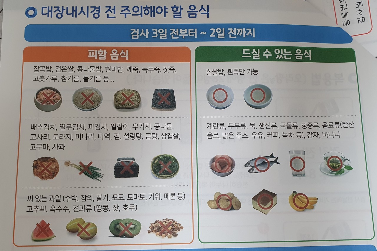 잡곡류, 콩류, 야채, 해조류, 김치 등 건더기가 있는 음식 먹지 않고 계란, 두부, 생선, 햄, 닭고기는 가능합니다. 대장내시경 전날 음식