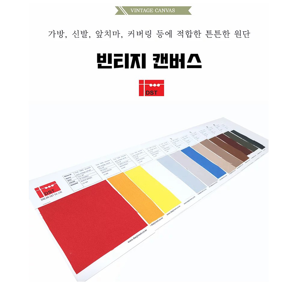 스마트스토어에서 판매되는 모든 제품은 지속가능한 원단인 재활용 폴리에스터로 제작됩니다. 또한, 생산과정에서 특허받은 친환경 공법이 적용되어 친환경 원단이라고도 불립니다. 빈티지 캔버스첫 번째로 소개할 원단은 빈티지 캔버스 원단입니다. 다양한 색상으로 생산되는 캔버스 원단은 디자이너들이 가방을 만들기 위해 구매하는 경우가 많습니다. 신발은 물론 가방, 다양한 패션 소품에도 적용 가능합니다. 또한, 흔히 파라핀이나 오일을 사용하여 표현되는 빈티지 효과는 수성 함침 방식으로 제작되어 친환경적이며 오일이나 파라핀에 노출되지 않는 특징이 있습니다. 그리고 더욱 놀라운 점은 파라핀이나 오일로 처리한 캔버스 원단과 마찬가지로 자연스러운 주름과 긁힘 효과가 나타난다는 점입니다.