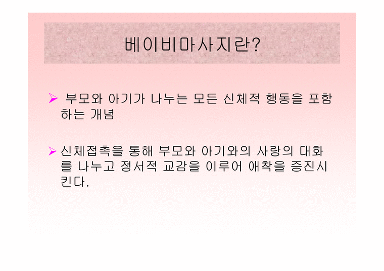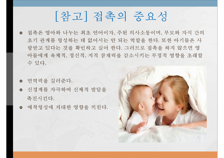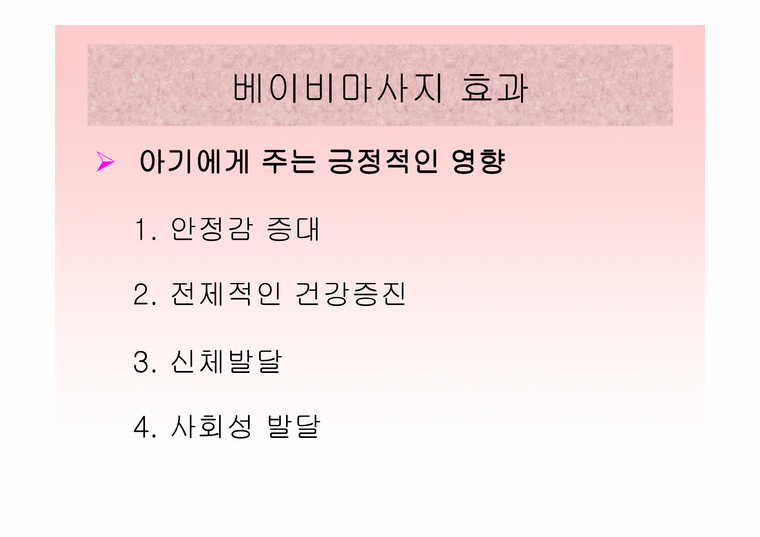 베이비 마사지 효과 – 신생아의 오감 발달에 도움을 줄 수 있습니다. – 아이에게 정서적 안정을 주는 가장 손쉬운 방법입니다. – 정서적 안정은 장래 대인관계의 기초이기도 합니다. – 나눔을 통한 특별한 유대감 형성 그리고 감정에 공감하는 것이 도움이 된다.