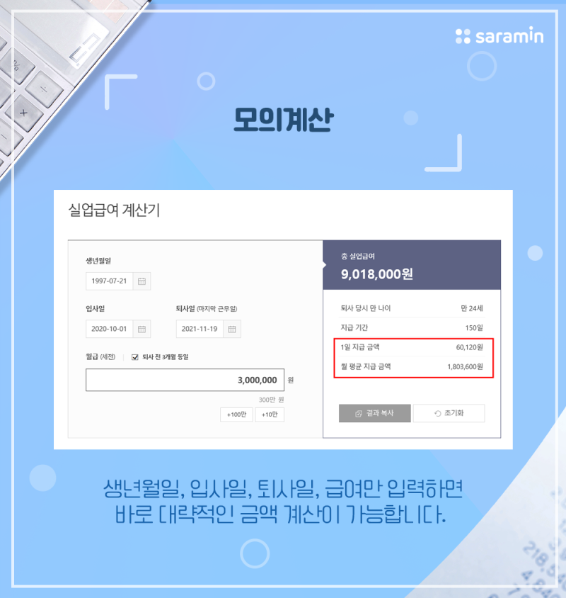원치 않는 실업을 경험한 적이 있나요? 사회를 살아가다 보면 피할 수 없는 변수가 발생하게 됩니다. 이런 분들에게는 실업급여가 지급됩니다! 실업자를 위한 제도입니다. 이번에는 정책의 조건과 적용방법에 대해 알아보겠습니다. , 기간, 금액, 계산까지 설명해드립니다. 꼭 따라해주세요! (목차)1. 실업급여 조건 2. 실업급여 신청방법 3. 실업급여 금액/계산기 4. 실업급여를 시간제로 받을 수 있나요?