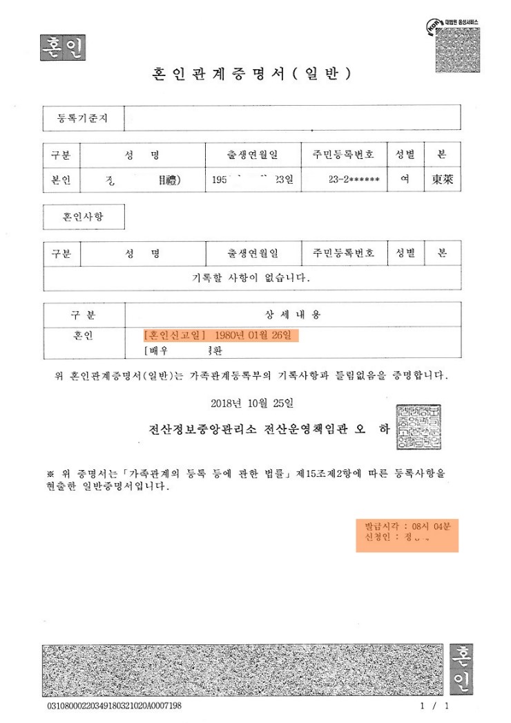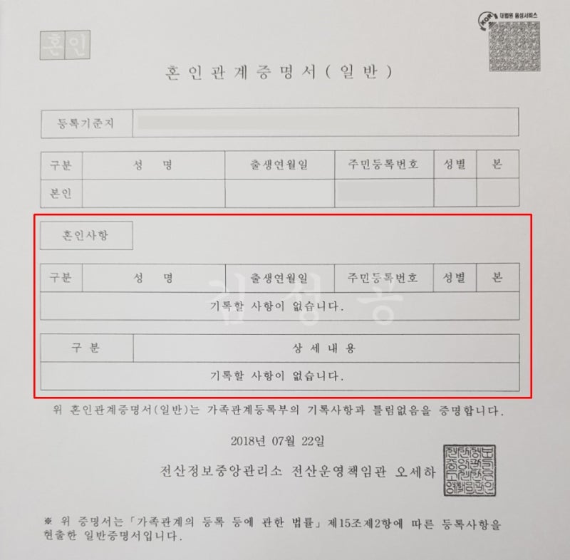 온라인으로 발급된 혼인증명서(무인기, 동굴홀)