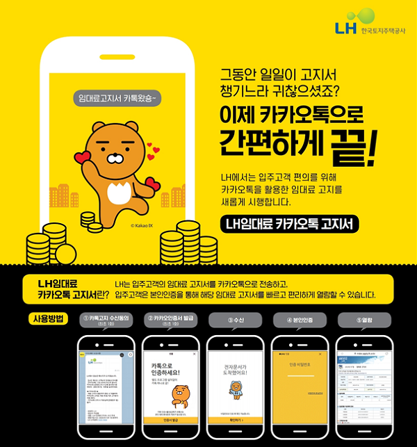 LH렌트 카카오톡 청구서는 무엇인가요? LH 임차인에게 임대료 고지서를 카카오톡으로 전송하고, 임차인이 본인인증을 통해 빠르고 편리하게 임대료 고지서를 조회할 수 있는 서비스입니다.