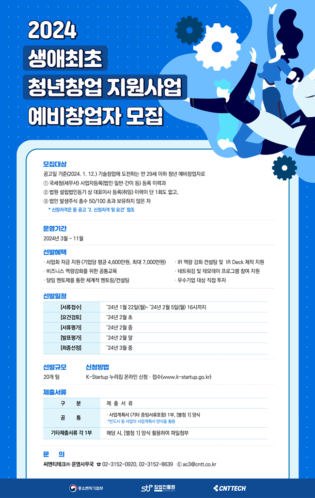 발표일 기준으로 29세 이하의 젊은층을 타깃으로 하고 있습니다. 지원자는 대표이사 사업자등록증 또는 대표이사 법인등록 이력이 없어야 하며, 전기, 전자, 정보, 통신, 바이오, 의료, 에너지 등 기술 전 분야에 걸쳐 창업을 시도하는 청년들을 지원합니다. , 및 리소스. 공고일 기준으로 내국법인의 발행주식 총수가 50%를 초과하는 경우 사실상 대표자로 간주되어 신청할 수 없습니다. 또한, 국세, 지방세를 체납하거나 금융기관의 체납 규제를 받는 경우에도 신청이 가능합니다. 제외되므로 사전에 확인하시는 것이 좋습니다.